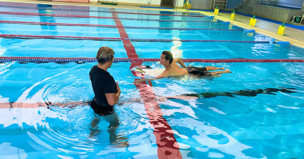 「水の抵抗を減らす」「効率的に進む」動きを、プロスイマーが解説・指導。今よりも楽に波をキャッチできる様になります。