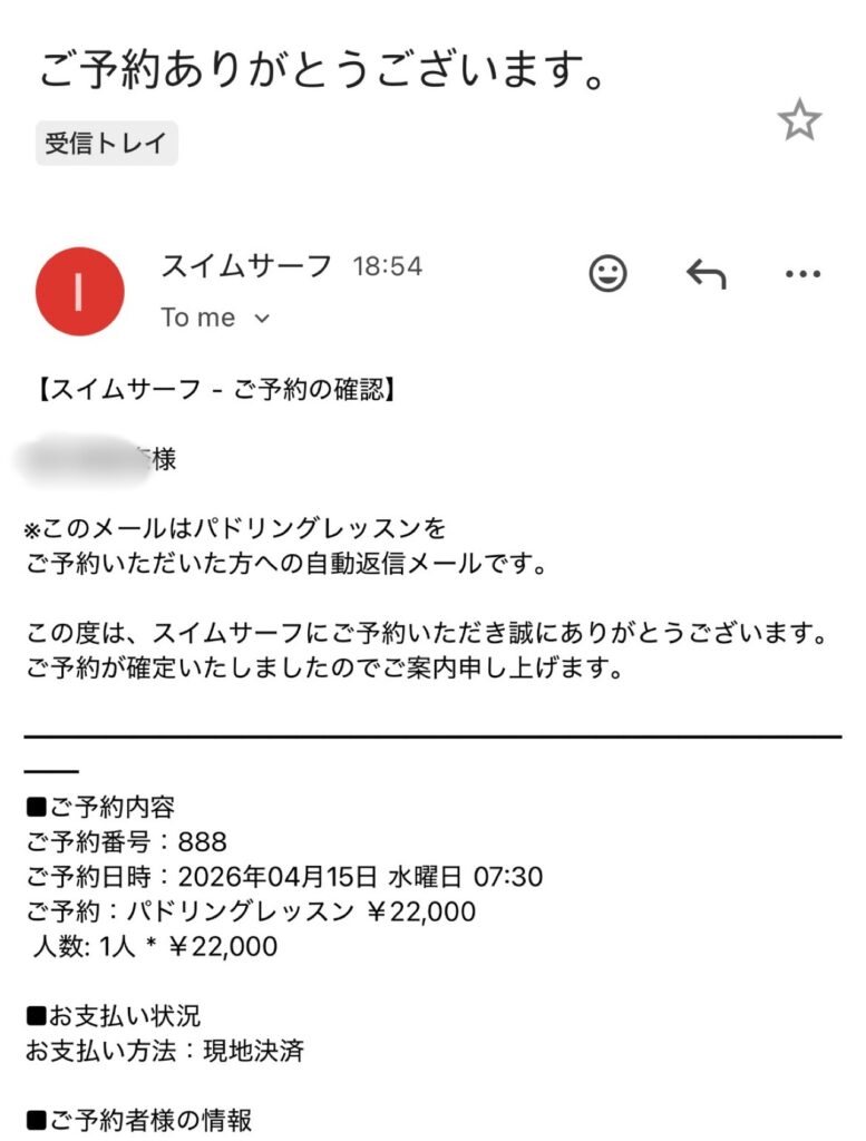 予約フォームに必要事項を入力してメールを送信すると、すぐにあなたのアドレスにスイムサーフから下記のメールが届きます。(届かない場合は迷惑メールもご確認ください)
